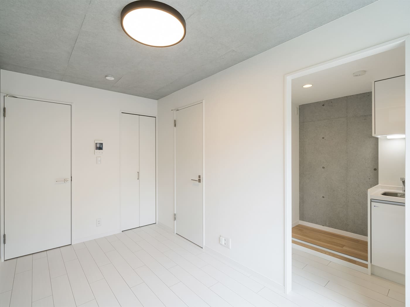 当該物件は、グレー・ベージュのタイルとコンクリート打ち放しの二層で作られたスタイリッシュな外観が特徴です。室内は、白基調の壁紙にコンクリート打ち放しが一部アクセントになっております。立地については都営三田線「本蓮沼」駅から徒歩5分で行く事ができます。